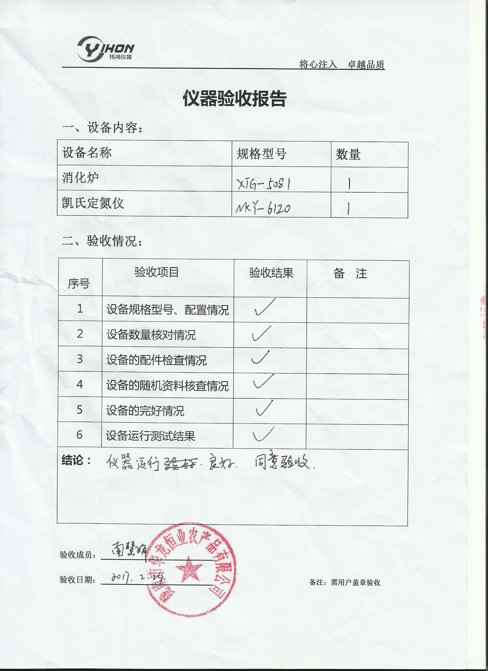 隴南市華龍恒業(yè)農(nóng)產(chǎn)品有限公司對凱氏定氮儀通過多方比較、調(diào)研、技術(shù)交流,最終選擇與我司上海祎鴻分析儀器有限公司順利達(dá)成合作,并于2月底驗(yàn)收通過,對我司提供的NKY6120全自動顏色法凱氏定氮儀和XTG5081碳纖維紅外消解儀給予高度的評價,明確指出實(shí)用性強(qiáng),智能化程度高,數(shù)據(jù)精確可靠。