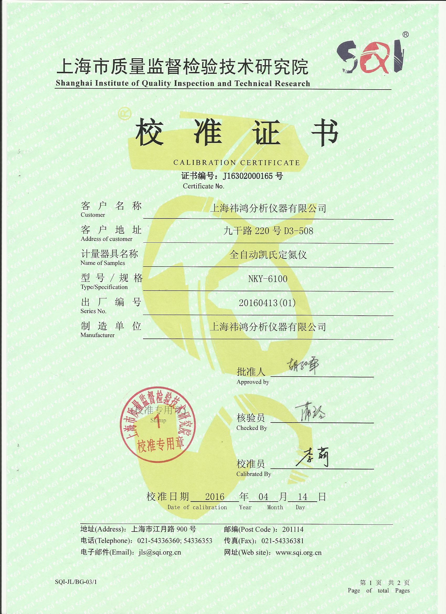 陽光明媚的5月,上海祎鴻分析儀器有限公司自主研發(fā)生產(chǎn)的全自動(dòng)凱氏定氮儀NKY6100系列獲得了上海市質(zhì)量監(jiān)督檢驗(yàn)技術(shù)研究院頒發(fā)的計(jì)量校準(zhǔn)證書。
