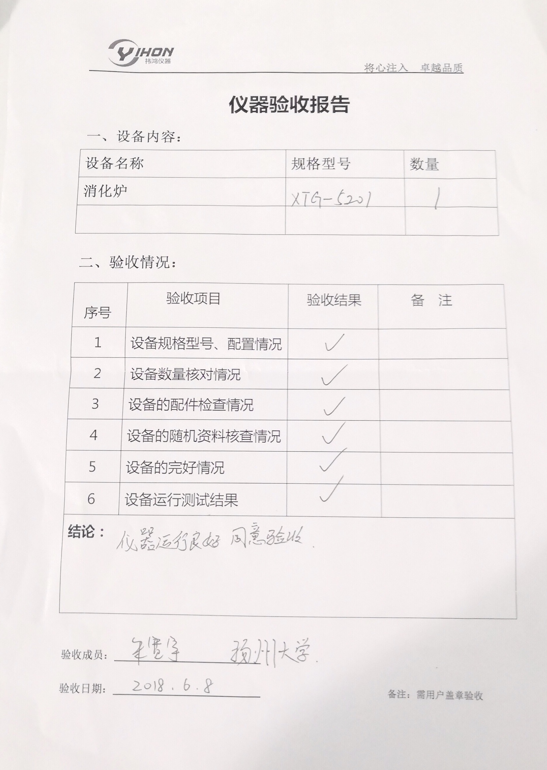 揚州大學(xué)近期采購消化爐XTG-5201一臺,祎鴻已于6月完成產(chǎn)品驗收。XTG-5201紅外消解儀采用電熱絲復(fù)合真空加熱技術(shù),升溫效率高,溫度均勻性好,可為揚州大學(xué)相關(guān)專業(yè)對種子、土壤、植株、飼料、礦石等化學(xué)分析之前的樣品進行消解處理。