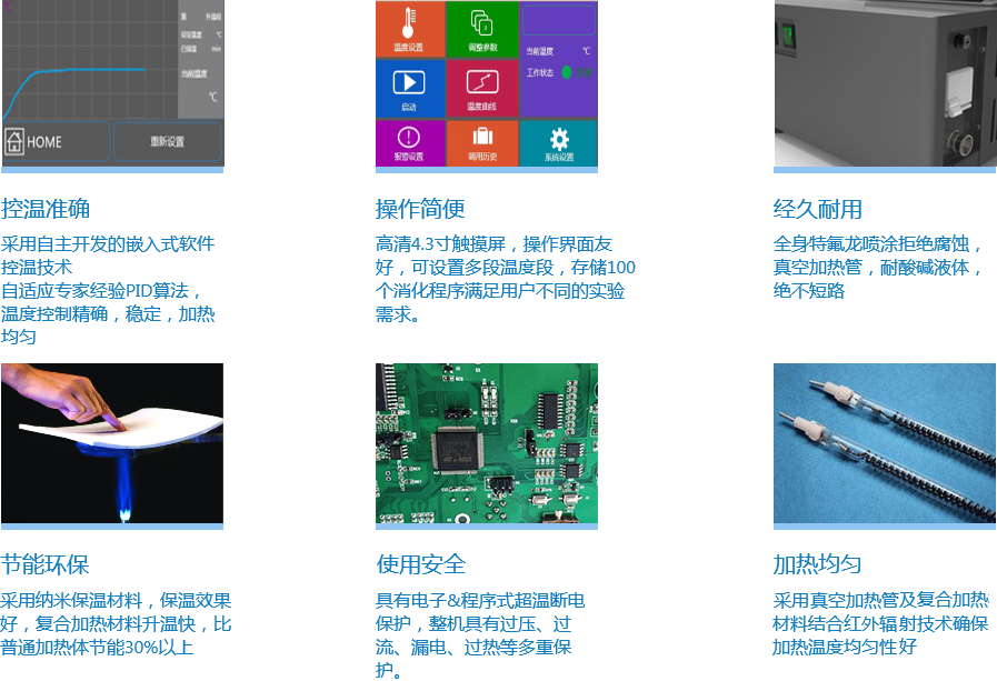 XTG5081紅外消解儀采用電熱絲復(fù)合真空加熱技術(shù),升溫效率高,溫度均勻性好。采用行業(yè)領(lǐng)先的納米云隔熱材料,熱效率高,節(jié)能環(huán)保。更具有4.3寸高清LCD觸摸屏操控界面,簡(jiǎn)單易懂,并具實(shí)時(shí)顯示溫度曲線功能,摒棄了以往溫控表頭繁瑣的操作。